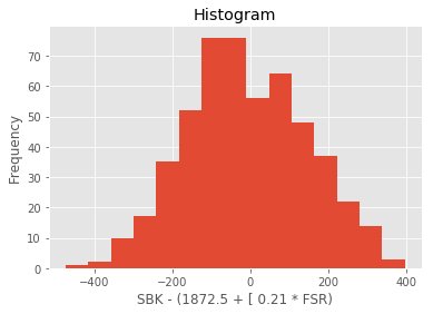 I then generated the modelled prices for the output (y) stock using the data for the training year, subtracted that from the price of the input stock (x) (there’s the long and the short!), and tested the difference for stationarity. If it wasn’t stationary, then, assuming the premise for the pairs trade holds, we couldn’t expect the pair to revert towards each other after they move apart. If it was stationary, then a histogram of the values of the long-short pair (ie the difference) should be approximately normally distributed.