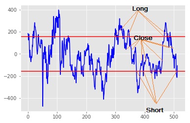 - If the long-short price is above 0.3 standard deviations and we’re short, then close out the long/short positions. (I.e. move to cash; add the profit or loss to the new notional cash balance)