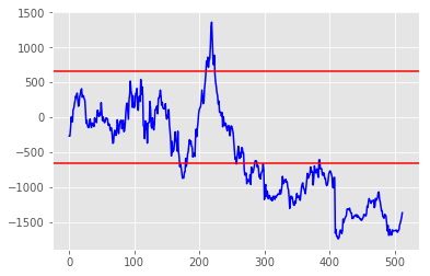 A graph of the daily value of the SBK-FSR long short pair (blue) and a single standard deviation of the values (red). The different trades are indicated by the orange lines: Long = 2 above, Short = 4 and Close = 3 and 5. Recall that trading only starts mid way through the graph.